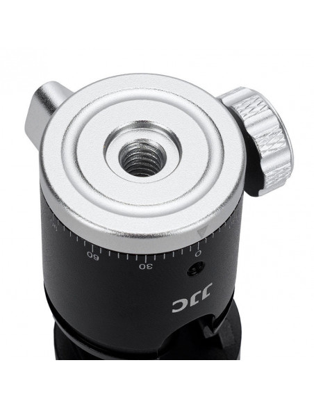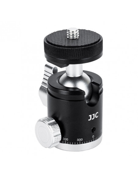 Stable support for your devices The JJC BH CM1 Ball Head is made of high quality aluminium alloy, making it sturdy, durable and resistant to deformation. It can carry up to 5 kg, providing stable support for your devices. Highlights Versatile compatibility Flexible movement options Load capacity up to 5 kg Versatile compatibility The top has a 1/4 20 screw thread, allowing you to easily attach cameras, webcams, phone holders, smartphone rig cages and monitors. By turning the rotating round plate, the top can be converted into a cold shoe mount. This makes it possible to mount accessories such as microphones or LED lights with a cold shoe. Flexible movement options The ball head has a diameter of 19 millimetres, which allows for flexible rotational movements and makes it easy to find the ideal shooting angle. The long knob allows you to rotate your equipment 360 degrees and tilt it 90 degrees. In addition, the round knob allows you to rotate the base 360°, ideal for stable panoramic shots. Precise adjustment A scale on the bottom helps you to accurately determine the desired shooting angle. This allows you to set up every shot perfectly, regardless of the situation. Stable mounting The bottom of the ball head has a 1/4" 20 screw hole, allowing it to be mounted directly on a tripod. This provides more stability and reduces unwanted vibrations during use., 5kg load capacity Base rotates 360° 90° tilt Compatible with cameras, microphones and accessories The turntable offers two connection options on the top: 1/4 20 screw thread or cold shoe mount Precise scale for optimal shooting angles 1/4" 20 female screw thread Made of high quality aluminium alloy 2 year warranty