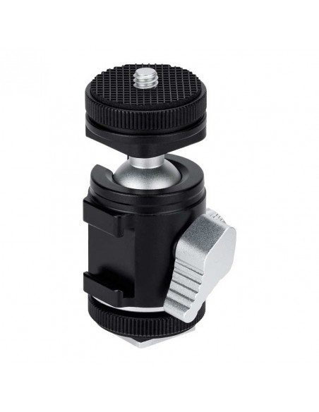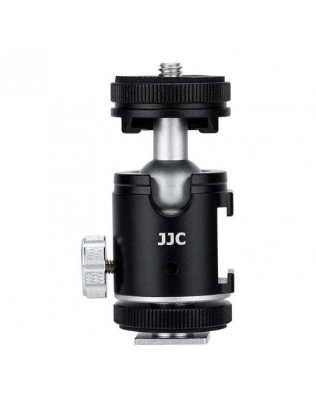 Ball head with cold shoe mount The JJC BH SM1 Ball Head with Cold Shoe Mount is a reliable and stable ball head with cold shoe mount for camera equipment weighing up to 3.5 kilograms. Highlights Flexible positioning Versatile mounting options Load capacity up to 3.5 kg Durable and versatile ball head Made from high quality aluminium alloy, the ball head is strong, durable and resistant to deformation. On top is a 1/4" 20 thread, compatible with cameras, webcams, phone holders, smartphone rig cages, monitors and more. By turning the rotating round plate, the top can be easily converted into a cold shoe mount for accessories such as microphones, LED lights or other cold shoe devices. There is also a cold shoe mount on the side, which can be used to connect additional cold shoe accessories. Flexible positioning With a 19 millimetre diameter ball head, the BH SM1 offers flexible rotation for effortless adjustment of the ideal shooting angle. The long knob allows for a full 360 degree rotation and a 90 degree tilt, while the round knob supports a basic 360 degree rotation. This makes the ball head ideal for taking stable panoramic shots. Versatile mounting options The cold shoe on the bottom allows mounting on a camera, expanding the interface for external devices. This allows you to easily attach a monitor or phone holder while using your camera. The 1/4" 20 screw hole on the bottom also offers compatibility with tripods, providing extra stability and minimal vibration., Load capacity of 3.5 kg, for stable support of your devices Made of high quality aluminium alloy, sturdy, durable and resistant to deformation The rotating plate offers two connection options on the top: 1/4" 20 screw thread or cold shoe mount Equipped with a cold shoe mount & a 1/4" 20 screw thread on the bottom 360 degree rotation and 90 degree tilt An additional cold shoe on the side 2 year warranty