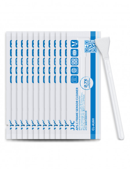 Sensor Cleaner Kit The JJC CL A16K2 Sensor Cleaning Swab Kit cleans APS C size CCD and CMOS sensors. The swab is vacuum packed and has a V shape that effectively reduces contact with the sensor. The swab is lined with high quality microfibre that has a high attraction to dust. This kit contains 12 swabs. Highlights Cleans 2.7 times better than its predecessor For cleaning APS C size CCD and CMOS sensors V shaped design effectively reduces contact with the sensor Swap width equals APS C sensor width Coated with microfibre for effective dust and dirt removal Swab width equal to full frame size sensor The CL A16II swab not only removes dust and dirt, but also leaves no lint behind after cleaning. Moreover, the sensor cleaner has a width of 16 millimetres which is equal to the size of an APS C size sensor. In addition, the swab is also ideal for cleaning sensitive surfaces of other devices, such as smartphones, keyboards, LCD screens and glasses., Model: JJC CL A16K2 Weight: 2 g Dimensions: 12 Ã 3.8 Ã 0.8 cm 2 year warranty