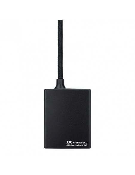 The fast card reader you can use anywhere Are you done with your files being transferred so slowly. Luckily, JJC has designed the JJC CR CFA BLACK Card Reader this card reader is designed for CFexpress Type A cards and it supports USB 3.2 Gen2. With a transfer speed of 10Gbps, you can transfer your data quickly and efficiently. With a dual connector of Type C and USB A allowing you to use the card reader for all desktop computers, laptops and mobile phone so you can use it anywhere. Highlights Suitable for CFexpress Type A cards Plug and play Type C and USB A connection Compatible with Android, windows Mac OS and IOS iPhone 15 Connection Because the card reader is equipped with a dual connector, you can therefore connect devices that use a Type C or USB A connection, which are e.g. desktop computers, laptops and mobile phones. This means that wherever you take a mobile phone with you, you can use the card reader and for that there is no additional driver download you plug it into your phone and it works immediately. Durable housing With its durable and compact aluminium alloy housing, heat dissipation is perfect, so the cards never overheat and offers a reliable guarantee of continuous operation of the card reader. Compatible and plug and play The card reader is plug and Play and does not require any drivers, making it compatible with many devices such as Android, windows XP/Vista/7/8.1/10/11, Mac OS and iOS is compatible if you have an Apple 15 series phone. This allows you to use the card reader over all on many different devices. , For CFexpress Type A memory cards Supports USB 3.2 Gen2 with transfer speeds up to 10Gbps Dual function plug with Type C and USB A for versatile connectivity Durable aluminium alloy casing for effective heat dissipation Wide compatibility with Android, Windows, Mac OS, iOS and Apple 15 series Additional USB C power input for stable performance Plug and Play functionality, no drivers required Designed for professional photographers and digital enthusiasts Weight: 41.96 g Product dimensions: 267 x 44.7 13.0 mm