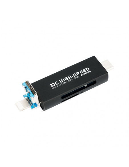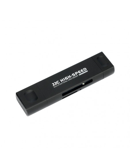 The multifunctional reliable card reader Looking for a card reader designed specifically for an iPhone running iOS 13 and above then the JJC CR UCL1 Memory Card Reader Black is the card reader for you. Featuring the ports: USB 2.0 Type A port, Lightning port and USB 3.0 Type C port you can connect it with many different devices. There are 2 card slots one for SD and the other for MicroSD. Highlights Compatible with (micro)SD cards up to 1 TB (SD, SDHC, SDXC) Compatible with USB A 2.0, USB C 3.0 and Lightning connections Data transfer rate Of 90 MB/s Plug and Play Durable housing Plug and Play compatible As the card reader features USB 2.0 Type A, Lightning and USB 3.0 Type C ports, you can connect many devices to it such as IPhone with IOS 13 or higher, laptops and computers. so you can move over all your files without any problems due to the reading speed of 90 MB/s, it can also be very fast. The card reader does not require any additional drivers you connect the card reader to your device and it is immediately ready for use. Durable housing The entire housing is made of high quality aluminium alloy that is durable and good for heat dissipation. Double protective caps ensure the connectors remain dust free and undamaged. The housing is very compact so easy to carry. Card slots On the card reader there are 2 card slots suitable for SD, SDHC and SDXC cards, as well as microSD, microSDHC and microSDXC cards with a maximum capacity of 1 TB this ensures that you can put almost any card in the card reader. , For iPhone running iOS 13 and above Features 3 ports: USB 2.0 Type A, Lightning and USB 3.0 Type C Expands 2 card slots for SD/microSD cards; read and write on both simultaneously Plug and Play design for easy and fast data transfer Achieves data transfer speeds of up to 90 MB/s Supports SD/microSD cards with a maximum capacity of 1TB Premium aluminium alloy casing for durability and heat dissipation Protective covers for connectors to prevent dust and damage Compact and portable design for easy carrying Weight: 18.6 Product dimensions: 73.4 x 19 x 10 mm Warranty: 2 years
