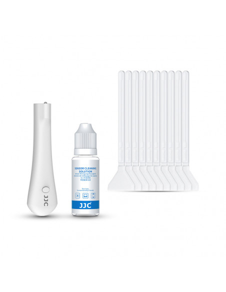 Complete cleaning kit The JJC Full Frame Sensor Cleaner Kit 2 is a comprehensive package designed to enhance your cleaning experience for full frame CCD and CMOS sensors. This kit includes ten individually wrapped sensor cleaning wipes, a bottle of sensor cleaning solution and an innovative cleaning handle. Highlights Suitable for full frame CCD and CMOS sensors Advanced cleaning wipes Innovative cleaning handle Advanced cleaning wipes Experience the Sensor Cleaning Swab's exceptional ability to safely and effectively clean full frame CCD and CMOS sensors. It is not just limited to sensors; delicate surfaces such as smartphones, keyboards, LCD screens, lenses and glasses also benefit from the gentle touch. This new version offers 2.7 times more cleaning power than its predecessor, providing a better cleaning experience with remarkable results. Vacuum sealed Each cleaning cloth is carefully vacuum sealed. Rely on high standards of cleanliness while preparing your camera and devices for optimal performance! Microfibre Excellence The end of the cleaning wipes is encased in high quality microfibre cloth, which removes dust and contaminants without leaving residue or scratches. Precision Design With a width of 24 mm perfectly matched to the dimensions of the full frame sensor, the cleaning cloth offers comprehensive and precise cleaning, effectively tackling dust and smudges on sensor surfaces. The clever V shaped design increases efficiency while treating your sensor with utmost care. Safe Cleaning Solution The specialised cleaning solution offers a safe and effective way to clean sensors, lenses and delicate devices. This non toxic and eco friendly formula contains no harsh chemicals and ensures the safety of your valuable equipment. Innovative cleaning handle Discover the joy of cleaning sensors with our innovative handle. The elongated design provides an easy and comfortable grip, making cleaning sensors easy.The built in illumination light on the handle takes cleaning to the next level, revealing even the tiniest dust particles for an incredibly thorough process. Experience the magic of precision cleaning like never before!, Dimensions: 123 x 40 x 20 mm Weight 71.9 g 2 year warranty , 10 x Sensor cleaning cloth 1 x Sensor cleaning solution 1 x Cleaning handle 1 x CR2032 battery 1 x User guide