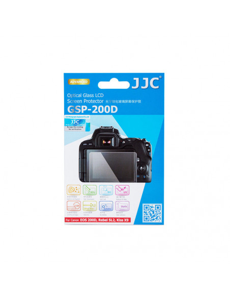 The JJC GSP 200D Screenprotector is an ultra thin optical glass layer just 0.3 millimetres thick to protect the LCD display of the Canon EOS 200D SLR camera. Thanks to its light transmission of 95%, you maintain good visibility of the information and images on your screen.