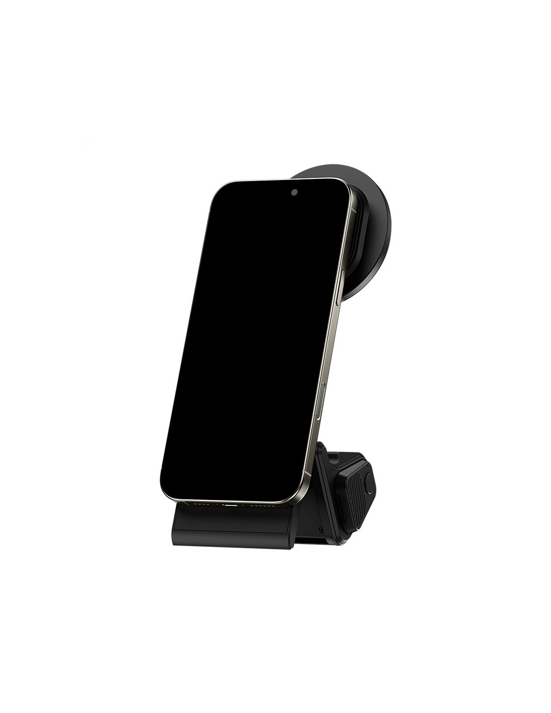 Pladen er udstyret med 16 stærke magneter og sikrer pålidelig fastgørelse af telefonen. Kontaktfladen mellem grebet og telefonen er stort set dækket af silikone, hvilket effektivt forhindrer ridser i langvarig brug. Et 1/4" 20 skruehul i bunden giver mulighed for fastgørelse til en tripod, og et snorhul understøtter brugen af den medfølgende håndledsrem til sikrere udendørs transport.