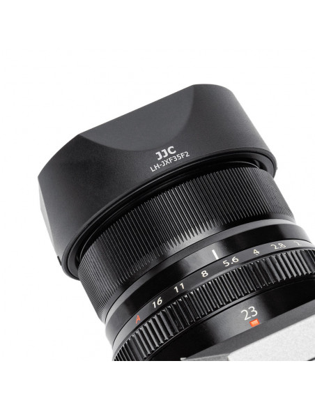 Prevent unwanted stray light The JJC LH JXF35F2 Lens Hood is compatible with FUJI. XC 35mmF2, XF 23mmF2 R WR and XF 35mmF2 R WR lenses. Highlights Compatible with Fuji XC 35 mm F2, Fuji XF 23 mm F2 R WR, Fuji XF 35 mm F2 R WR lenses Prevents unwanted light from entering the lens Square design at the front, compact and refined No vignetting The lens hood has a square, tapered design at the front, which is compact and refined. No vignetting occurs when using this lens hood. The use of 43 mm filters and the original lens cap is not affected. In addition, extending the front of the lens effectively blocks unwanted light. Protection The extended front also provides extra protection for the lens against accidental impacts. Ease of use This lens hood is made of high quality ABS material, which is sturdy and durable. The inside has a matte finish to further reduce lens flare., Matte finish on the inside further reduces lens flare No vignetting when the lens hood is attached 2 year warranty