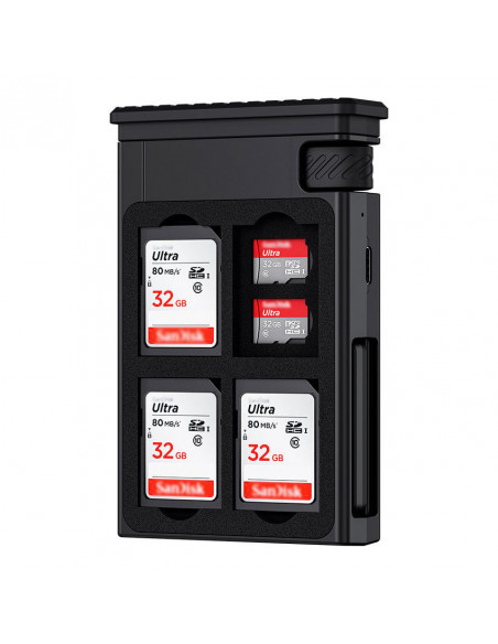 Multifunctional card station The JJC MFCC 1 BLACK Multifunctional Card Station combines a card reader, card case and multifunctional adapter organiser in one compact and versatile solution, ideal for travellers. Highlights Combines a card reader, card case and adapter organiser in one device Soft EVA slots accommodate up to 8 SD cards and 16 Micro SD cards Includes 4 versatile adapters for different device interfaces Stylish and durable design The premium aluminium alloy housing is not only stylish but also durable. A convenient twist knob allows you to easily open and close the station. Generous storage capacity The soft, custom made EVA card slots on both sides can hold up to 8 SD cards and 16 microSD cards, covering all your storage needs. Versatile adapter holder The detachable adapter holder contains four adapters: Type C to Micro USB, Type C to Type A, Type C to Lightning and an OTG adapter. These adapters are compatible with various device interfaces, making it easy to remove or install memory and SIM cards. In addition, they can be connected to Type C data cables to compensate for unexpected power shortages while travelling. Fast and efficient card reader The MFCC 1 also functions as a fast card reader compatible with UHS II memory cards. With the included USB C 3.1 Gen 2 cable, it supports transfer speeds of up to 300 MB/s*. The dual slot design allows simultaneous reading and writing of an SD card and a microSD card, with support for storage capacities up to 1TB. Real time file transfer The dual slot allows simultaneous reading and writing from an SD card and a Micro SD card. This feature makes it easy to transfer files, photos or videos from your camera's memory card to your phone while on the go. This allows you to share your travel moments instantly, wherever you are. Stable and portable The thickened silicone anti slip pad on the bottom prevents slipping or falling during use, even outdoors. In addition, the station is equipped with a key cord hole, which allows you to attach an optional carrying strap for easy transport. * 300 MB/s refers to the transfer speed of the memory card, not the speed of the USB C 3.1 Gen 2 data cable, which supports a maximum data transfer speed of 10Gbps., Comes with a USB C 3.1 Gen 2 data cable Compatible with UHS II cards, supports transfer speeds up to 300 MB/s Enables reading and writing for both SD and microSD cards Equipped with a card ejector Features a stylish, durable aluminium alloy housing with a rotary knob Non slip silicone pad on the bottom ensures stable placement Equipped with a lanyard hole for an optional carrying strap 2 year warranty