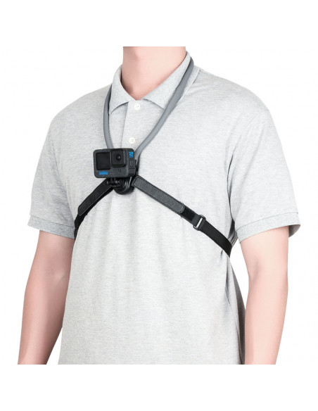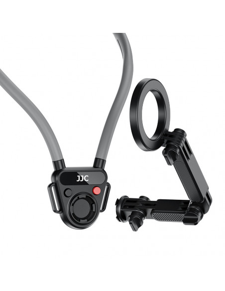 Magnetic neck holder The JJC MNM MS1 Magnetic Neck Holder for Action Camera & Phone is compatible with MagSafe phones and action cameras of various brands. It mounts devices at chest or neck height for POV (Point of View) shots. Ideal for activities such as hiking, cycling and vlogging, it captures a first person perspective, giving viewers an authentic experience of the user's point of view. Highlights Ideal for activities such as hiking, cycling and vlogging Wrapped in soft silicone for a comfortable touch Features a small airbag on the back for greater comfort Magnetic design, easy switching between horizontal and vertical mode With suction power of up to 2.2 kg Ergonomic design The neck holder is encased in soft silicone, ensuring a comfortable touch. The ergonomic design fits snugly on the neck and provides long lasting comfort, even during prolonged use. The back has small air cushions that help buffer pressure on the chest, increasing overall comfort. The product can be curved to better fit the contours of your body, reducing shaking while recording. It also includes a chest strap with Velcro to minimise the impact of body movements on recording quality. Magnetic design The magnetic attachment lets you quickly switch between horizontal and vertical orientation. With a magnetic force of up to 2.2 kg, it holds your phone firmly in place, so it won't accidentally fall and you can record or perform other tasks without worry. Moreover, the three locking buttons on the extension bar allow you to flexibly adjust the device's tilt angle, each with a range of at least 180°. The product has two buttons: a red button on the right side for quick one touch release, while a black button on the left side controls the direction of the holder in 90 degree increments to meet different shooting needs., Compatible with MagSafe phones and action cameras of different brands Suitable for POV (Point of View) shooting Wrapped in soft silicone for a comfortable touch Fits snugly on the neck for prolonged wear without fatigue Features a small airbag on the back for increased comfort Freely adjustable bending radius to fit the body contour and reduce vibrations Supplied with a Velcro chest strap Magnetic design, easy switching between horizontal and vertical mode With suction power of up to 2.2 kg One click release for carrying, safe and convenient Allows shooting at different angles 2 year warranty , 1 x JJC MNM MS1 Magnetic Neck Holder for Action Camera & Phone 1 x Velcro chest strap 1 x Magnetic Ring Kit 1 x Safety Strap 1 x Long thumb screw 1 x User guide