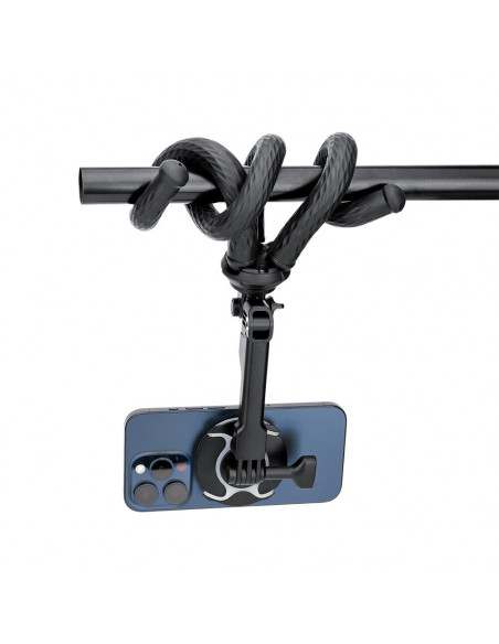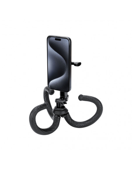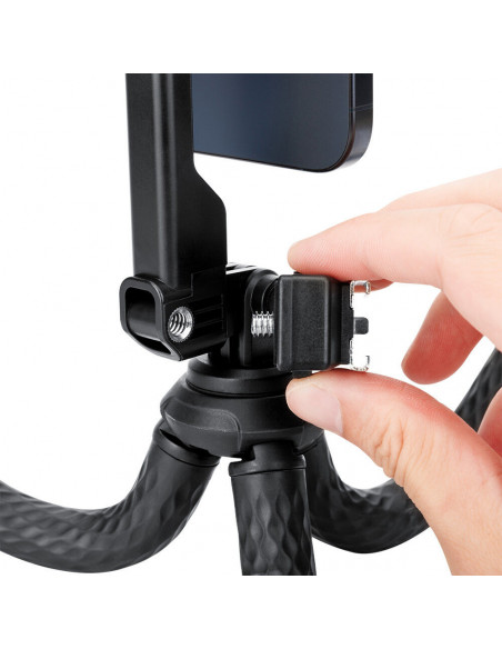 Flexible Tripod The JJC TP FT2 Flexible Tripod is a table tripod designed for vlogging, livestreaming and mobile filming with your camera or smartphone. It features a universal camera connection with a 1/4" 20 thread for cameras and a clamp for mobile phones. Highlights Flexible octopus legs for versatile use Ideal for vlogging, livestreaming and taking selfies Magnetic design for easy use Phone clamp The spring loaded phone clamp fits common smartphones from 56 to 95mm wide, and it features two 1/4'' 20 connectors for attaching to the tripod and mounting additional accessories such as microphones or LED lights. Landscape and portrait mode Like the phone adapter, the tripod head features two 1/4'' 20 connections for mounting additional accessories and the ball head can be rotated over 360 degrees and can be angled but it can also be fully tilted for portrait shots. Adjustment of the ball head is securely locked via a lever. Flexible silicone legs The tripod's flexible silicone legs are made of high quality silicone material. They are sturdy, durable and, above all, flexible. They can be bent into any shape, allowing for different setups. You can twist the legs together for handheld shots. But there are many more possibilities; you can bend them around beams, cables, ladders and much more, or completely flat for extra low angles. The tripod feet have round non slip silicone tips, which add extra stability and protect the surface from scratches., Compatible with iPhone with Mag Safe, action cameras and 1/4'' 20 cameras Multiple anti slip protections Suction power up to 2 kg, silicone ring and enclosed rubber strap Features two 1/4'' 20 screw holes Anti slip texture on legs adds extra protection Flexible silicone legs can bend and wrap around objects Can be converted to GoPro mount or 1/4" 20 screw 2 year warranty , 1 x MagSafe phone holder