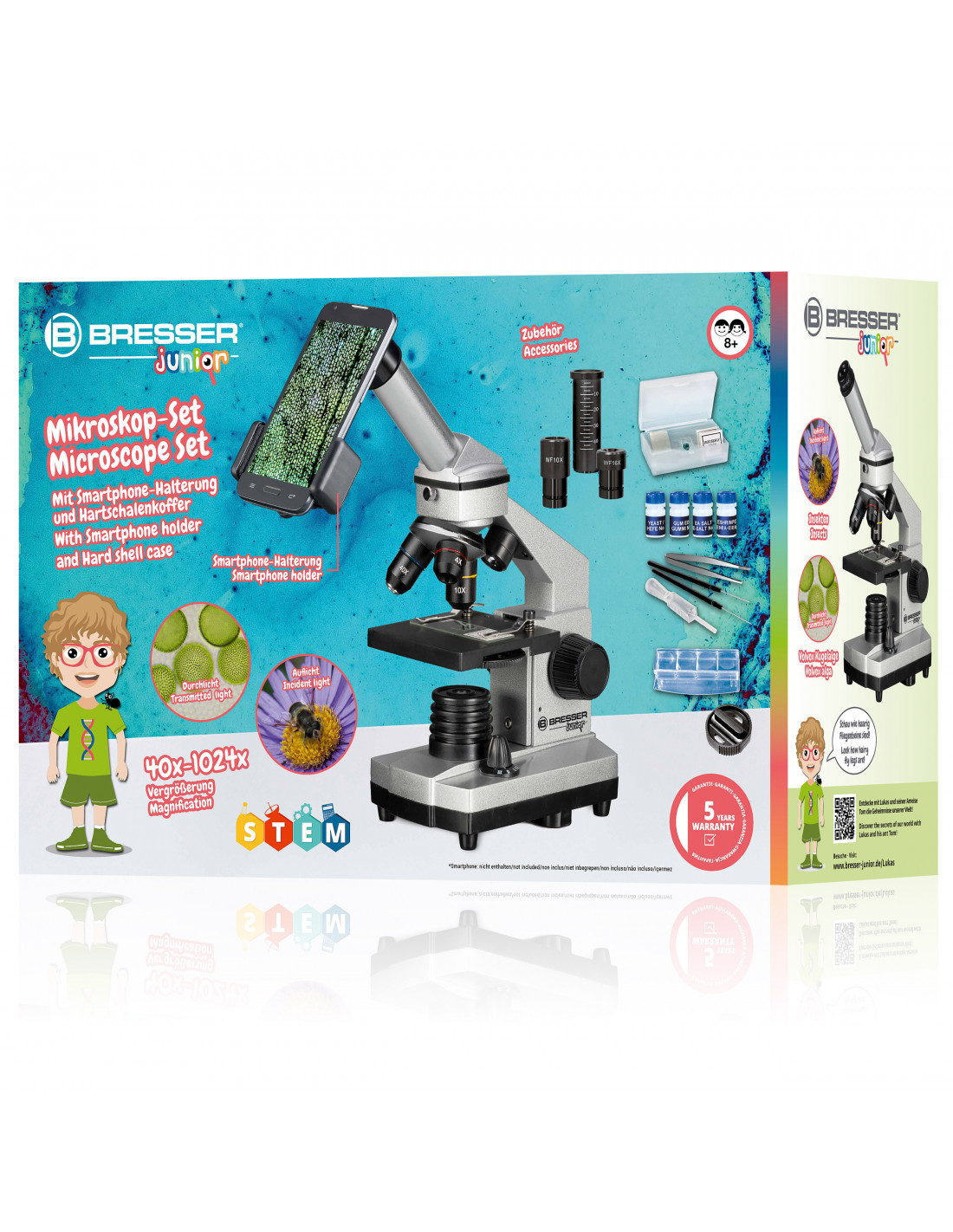 BRESSER JUNIOR - discover the world through play! More than just a classical microscope. This BRESSER microscope set is robust and versatile. Don't give children a simple toy as a present that soon will lie in a corner. With this microscope set with its extensive range of accessories which allows for an immediate entry into the world of the microcosm, children get so much more than just a simple toy. Promote scientific thinking and stimulate the thirst of knowledge of children. With this microscope children can explore themselves the world of the microcosm and what things are made up of.Make pictures through the microscope with your own smartphoneWith the included smartphone adapter this is going to be child's play! Attach your smarphone onto the littele suction cups of the adapter and place the camera lens in front of the eyepiece. Making pictures of Damit fotografieren Sie kinderleicht das Objekt unter Ihrem Mikroskop.FEATURESsolid metal housingvery versatile thanks to combinated incident and transmitted lightincident light for observation of non-transparent objectstransmitted light for observation of transparent objectsuniversal bracket enables taking pictures with your own smartphonebattery power supply and transport case make it very mobileincludes experiment kit for breeding brine shrimp (Artemia)extensive range of accessories for a quick startSCOPE OF DELIVERYMicroscopetransport casesmartphone adapter2 eyepieces (WF10x, WF16x)3 obective lenses (4x, 10x, 40x)Barlow lens5 blank slides5 cover platesPipetteMountantMicrotomeExperiment kit (magnifier box, brine shrimp eggs, yeast)Salt3x AA batteriesManual