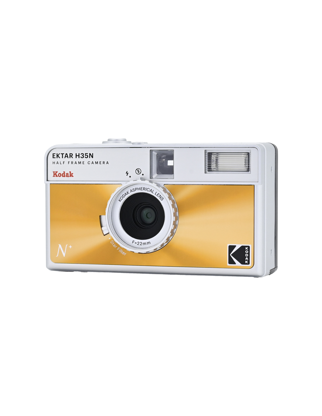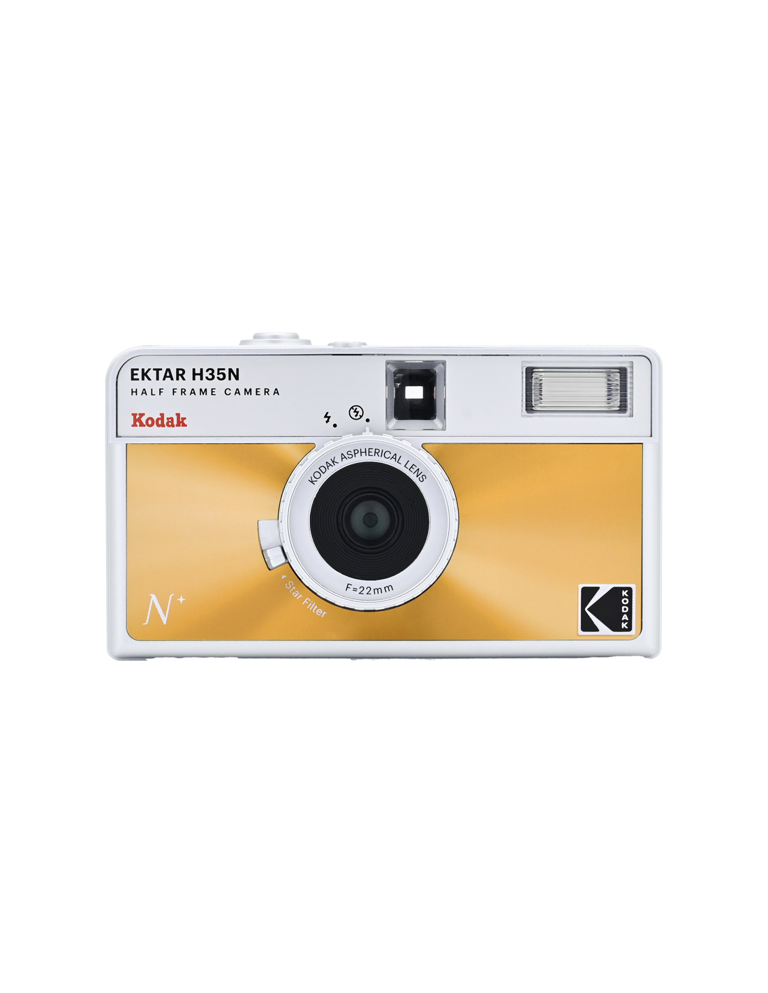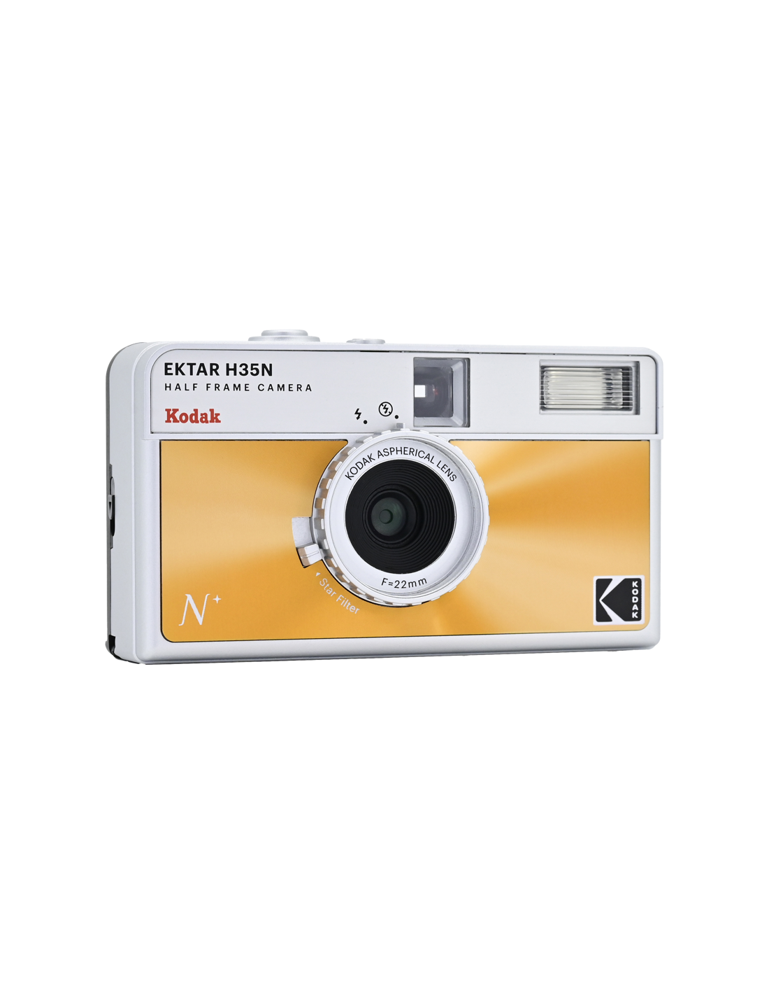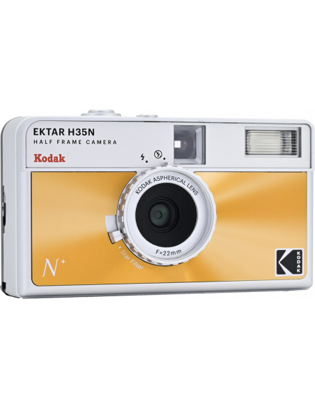 Det nye, forbedrede H35N-kamera har flere spændende funktioner, f.eks. et indbygget stjernefilter, en bulb-lukker, stativhul og en delvis glaslinse med coating.Half frame betyder, at hver eksponering er halvt så stor som en standardramme, hvilket resulterer i en mindre billedstørrelse, hvilket betyder, at du får 72 billeder på en 36-rulle og 48 billeder på en 24-rulle. Når du kigger gennem søgeren, ser du et lodret billede i stedet for et vandret, som du normalt gør.På det nye kamera har Kodak forbedret den optiske linse, og et element af akryllinsen er erstattet med en glaslinse, der hjælper med at forbedre billedets skarphed. Kameraet kommer også med et indbygget stjernefilter, der skaber en fire-strålet flare på lyspunkter.H35N er udstyret med en bulb-lukker og kabeludløser, som giver præcis kontrol over eksponeringstiden, hvilket gør det muligt at optage bevægelsesspor og gør det nemmere at bruge kameraet i svagt lys. Derudover er der indbygget et stativstik i kameraets base.Kameraet fås i seks stilfulde udgaver: stribet sort, stribet sølv, stribet grøn, glaseret blå, glaseret orange og glaseret pink.**NøglespecifikationerForbedret optikIndbygget stjernefilterPære-funktionRaffineret søger og tilbagespolingsknapStativFås i seks stilfulde udgaverFlash