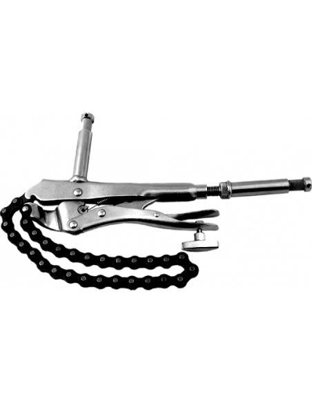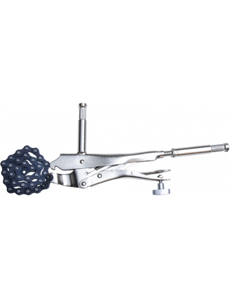 Denne clamp har to baby 5/8" (16 mm) stifte monteret på bagsiden og en anden i en ret vinkel i enden af håndtaget, der bruges til at justere stramningen, når den er låst fast. Stiftene har en riflet struktur, der forhindrer, at monteringen roterer, når det er låst på plads. Udløserhåndtaget har en sætskrue med en skrueknap for at forhindre, at klemmen åbnes ved et uheld, når den er låst på plads. Ideel til at holde uregelmæssigt formede stykker Let at justere tryk og pasform. Virker ved at dreje 5/8" baby stiften bag på klemmen Kæden er fremstillet af varmebehandlet legeret stål af høj kvalitet for at sikre robusthed og holdbarhed Begrænset 2-års garanti