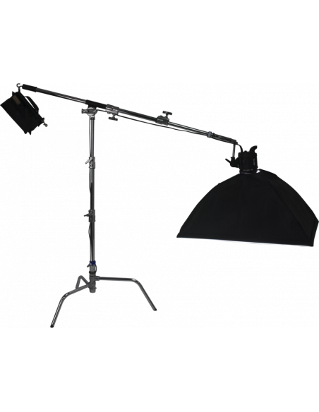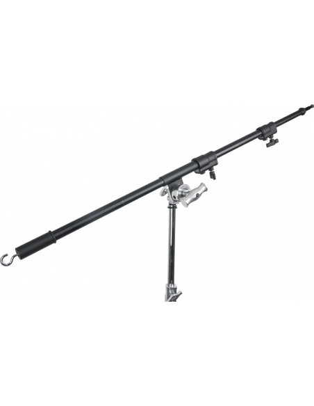 Denne lette aluminiumskonstruktion helt i metal har et "øre", der er designet til at passe mellem pladerne på et grip head. Den har en indbygget krog i bagenden til at tilføje sandsække som modvægt. Denne boom kan forlænges fra 1,1 2,4 m og kan bære 3 kg, når den er fuldt udstrakt. Baby Boom i aluminium leveres i en diskret sort finish. Placerer lysudstyrer direkte over kameraet eller motivet Forlænger fra 1,1 2,4m Kan bære 5 kg fuldt udstrakt Drejelig krog-ende giver mulighed for at hænge en sandsæk op for at opnå sikkerhed og støtte Boom arm af aluminium med sort finish