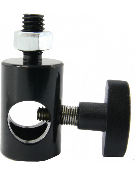Denne adapter består af en baby receiver med et 3/8"-16 hangevind fastgjort på toppen af den, der kan monteres på enhver baby stud med en sætskrue og en drejeknap, der låser den fast på plads.