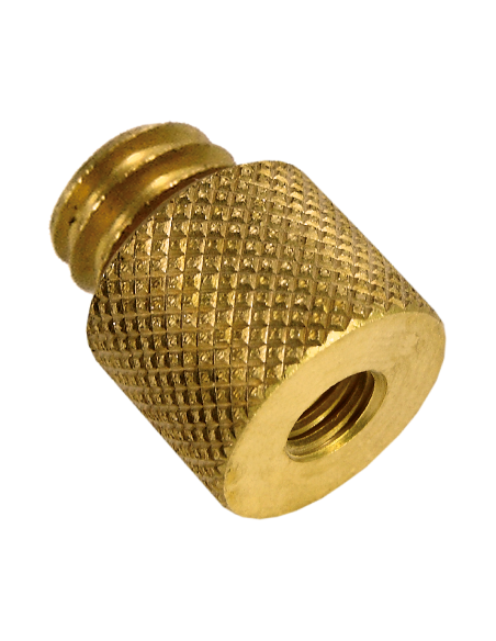 Dette er en lille adapter, der konverterer et 3/8"-16 hangevind til et 1/4"-20 hungevind. Den er fremstillet af messing.