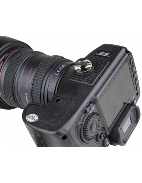Metalskruen passer direkte ind i bunden af et kamera via 1/4"-20-skruen. Der er også monteret en sort gummipude på 1/4"-skruen for at forhindre, at kameraudstyret bliver ridset.