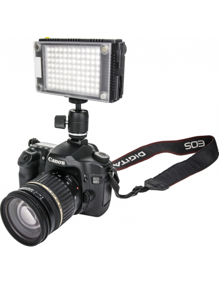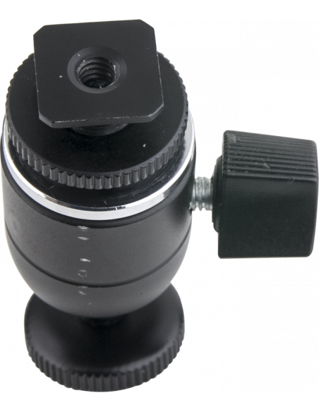 Det er muligt at bevæge kuglehovedet i alle retninger ved at løsne den nemme drejeknap. En ekstra rille gør det muligt for kuglen at vippe 90 grader i én retning Hot shoe-adapteren er også udstyret med et 1/4''-20 gevind i bunden af det solide kuglehoved af aluminium