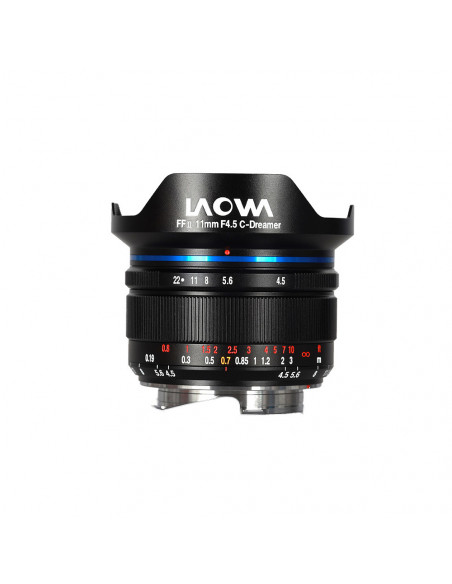 Small but powerful The Laowa 11mm f/4.5 FF RL Black Leica M is a super compact and lightweight Rectilinear (RL) wide angle lens for full frame (FF) mirrorless cameras. The remarkable 126° angle of view with a minimum focus length of 19 cm is found in the 6.3 cm long and 254 gram lens. With it, you can effortlessly capture beautiful landscapes, precious travel moments and stunning interiors. Highlights Remarkable 126º angle of view Built in 62 mm filter thread Superior image quality Extremely short focusing distance The lens contains 2 aspherical elements and 3 extra low dispersion elements to ensure sharpness and minimise chromatic aberrations and distortion. Conveniently, the 62 mm filter can be screwed directly onto the lens, or more filters are available with a 100 mm square filter frame. The 5 blade aperture creates a stunning 10 point sunburst. Notes A rangefinder connector is available for Leica M mount photographers, making the lens more accurate and easier to focus. Leica M mount is not compatible with Leica TL and CL cameras. , Focal length: 11mm Max. Aperture: f/4.5 Min. aperture: f/22 Angle of view: 126° Format compatibility: Full Frame Lens structure: 14 elements in 10 groups Aperture blades: 5 Min. Focusing distance: 19 cm Max. Magnification: 0.1 Filter size: 62 mm filter Dimensions 63.5 mm x 58 mm Weight 254 g Mount: Leica M
