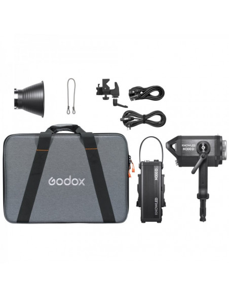 Godox M300D; controller; reflektor; controller klemme; tilslutningsledning; fast reb; lampe dæksel; strømkabel; bærbar taske; original emballage.