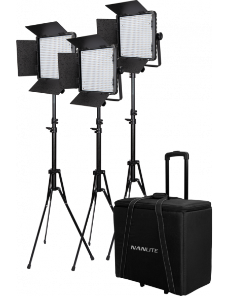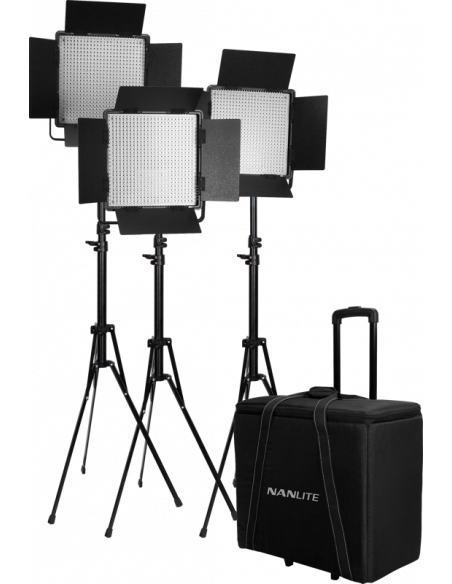 Lighting kit composed of 3 Nanlite 900CSA Colour adjustable LED panel With VLOCK Battery Feature and Barn Doors.