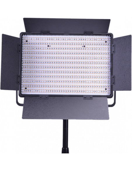 Ledgo LG-1200CSC 72W Bi-Color LED-studiebelysning med WiFi Studiebelysning med Bi-Color LED-lamper, som giver et dagslysbalanceret lys uden flimmer (3200-5600K) og uden den varmeudvikling, som forbindes med traditionelle tungsten-pærer. Belysningen er monteret i en U-ramme med 5/8" (16 mm) skruegevind til stativmontering og kan køre på enten strøm via den medfølgende AC/DC-adapter eller med et Sony V-lock genopladeligt batteri (ekstra tilbehør). Justerbart og farveneutralt lys Med en effekt på 72W kommer Ledgo LG-1200CSC op i lysstyrke på 5000 lumen. Lyset kan reguleres trinløst ved hjælp af den indbyggede lysdæmper, og skærmes af fire flapper, de såkaldte "barndoors". Belysningen kan også bruges sammen med en softbox (ekstra tilbehør), hvis der ønskes et blødere lys. LED-lamperne har en høj CRI-værdi (RA >95), hvilket giver en naturlig gengivelse af motivets farver. Da lampen er af typen Bi-color, kan farvetemperaturen indstilles i fine trin mellem 3200 og 5600K. Det er også muligt at komme op i 6500K med det medfølgende farvefilter. Fjernstyring via WiFi Ved hjælp af tilbehøret Ledgo 2.4G WiFi Controlbox er det muligt at styre lampen trådløst fra en smartphone eller tablet (app 'en findes til både iOS og Android). En trådløs fjernbetjening kan fås som ekstra tilbehør (Ledgo LG-A34).