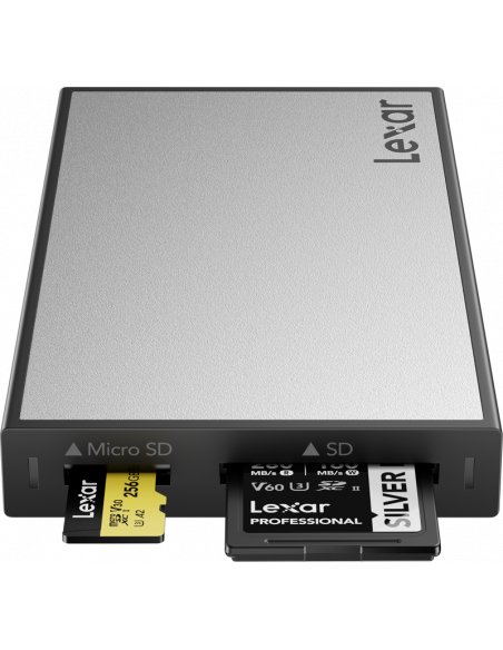 Lexar Professional Workflow SD/microSD UHS-II Card Reader, med en microSD- og en SD-kortplads, aflaster to kort samtidigt til workflow.Med en microSD- og en SD-kortplads giver Professional Workflow SD/microSD UHS-II Card Reader dig mulighed for at aflæse to kort samtidigt for en hurtigere arbejdsgang.Med Professional Workflow SD/microSD UHS-II Card Reader kan du overføre to kort på samme tid og få en hurtigere arbejdsgang. Den leverer op til 312 MB/s overførselshastighed (pr. slot), har en særlig ridsefast aluminiumsfinish og inkluderer et USB-C til USB-C-kabel og en USB-A-adapter. Den leveres også med en bekymringsfri 3-års garanti.SD- og microSD-kortpladser giver dig mulighed for at overføre indhold fra to kameraer eller enheder samtidigtLeverer op til 312 MB/s overførselshastighed (pr. slot), og begge slots kan arbejde samtidigt for maksimal effektivitetStærkere, men lettere: den særlige aluminiumsfinish giver bedre modstandsdygtighed over for ridserKompatibel med Lexar Professional Workflow og Workflow Go, som giver dig mulighed for at tilpasse læsere og bærbare SSD'er for maksimal effektivitetInkluderer et USB-C til USB-C-kabel og en USB-A-adapter, så den er klar til brug lige ud af æsken uden ekstra periferiudstyr.3 års garanti for din ro i sindet