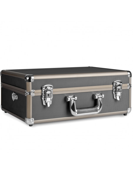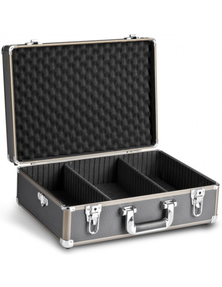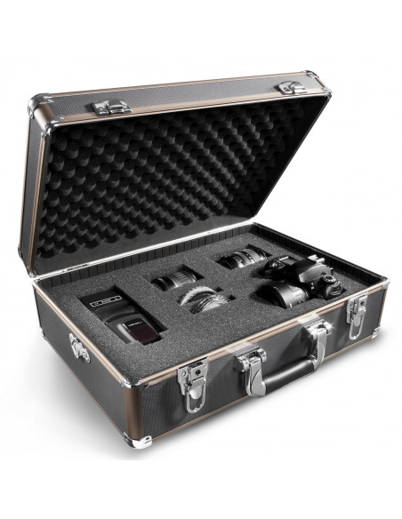 The workmanship of the photo case is excellent and offers sufficient space for a large SLR camera, digicams, or digital cameras with accessories. The base and top areas are well padded, the individual adaptation of the compartments is carried out via rods or foam padding. In particular the case is characterised by its solid and sturdy but nevertheless weight-saving workmanship. It is protected against splash water by a circular aluminium seam, and can be locked twice. All outer edges are rounded off and reinforced with aluminium caps. The lid has a very sturdy hinge with an integrated impact protection and the base has four plastic feet for the safe parking of the camera case.