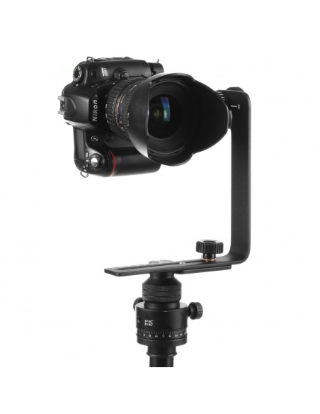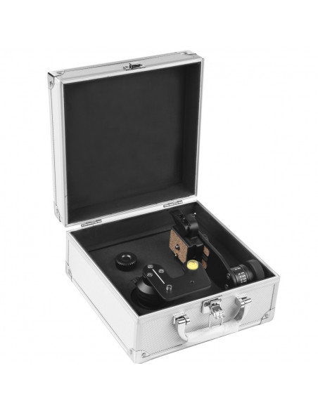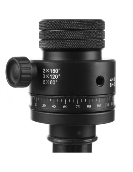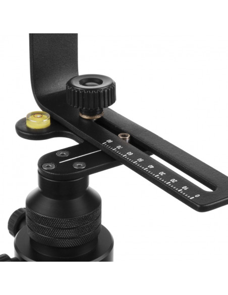 The system of vertical and horizontal rails with scales accurate to the millimetre ensures precise settings in constant angular increments. You can easily set the exact angle of rotation (possible are 2x180°, 3x120°, 6x60°, 4x90° or 8x45°) with the turntable. You can select the rotation steps depending on the lens attached. A spirit level on the head ensures precise levelling.