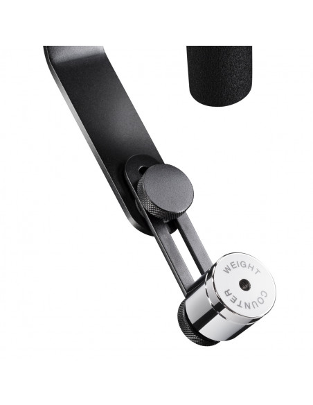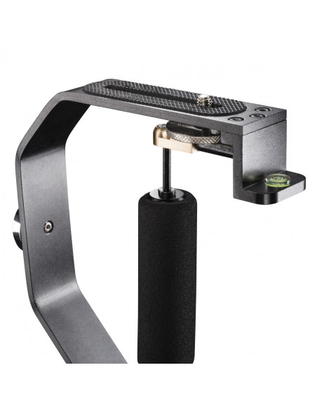 The steadycam stabilizes the camera and enables calm filming. This is ensured by the 30g and 100g counterweights, which are part of the delivery, which enable exact alignment of the camera. The pod is equipped with a bubble level for balance control. The camera is simply mounted to the camera mount by using a 1/4 inch thread. While you hold the pod with one hand, you keep you other hand free for the camera. The foam plastic encasure of the handle provides additional comfort when filming.