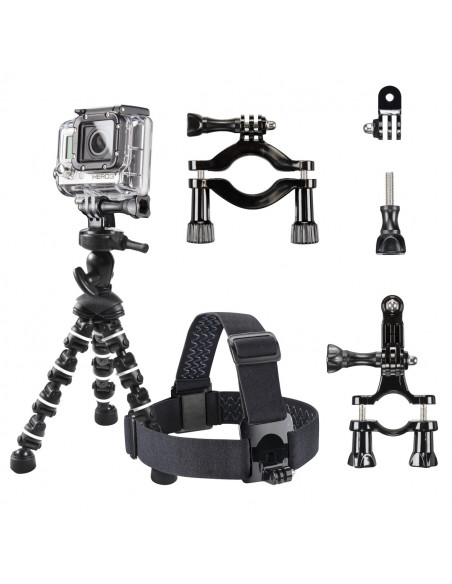 - 1x mantona GoPro Set Fishing, consisting of 1 x handlebar adapter, 1 x angle piece, 1x mantona tube fastenting for GoPro, 1x walimex pro Multiflex Tripod, 16,5cm with convenient quick-release plate, 1 x helmet strap for GoPro, 1 x tripod thread adapter, 1 x screw, 2 x nuts