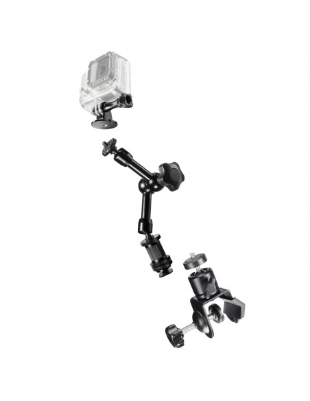 - 1x mantona GoPro clamp set III, consisting of 1x walimex Tube Clamp with Ball Head, 1x walimex pro walimex pro DSLR Swivel arm Magic 18, 1x tripod thread adapter, 1 x screw, 2 x nuts