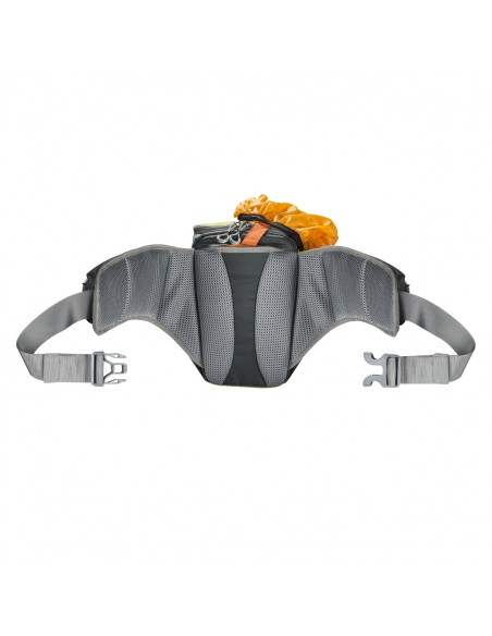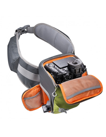 With integrated zip closed pockets on the lap belt, this compact bag provides adequate space for purse, smartphone or keys. The net compartment on the side of the bag offers space for a beverage bottle or other objects. The dimensions of the bag provide space for a camera with lens attached and a power supply unit or other smaller accessories. The lateral access to the separated compartment enables quick access to small items. A small sling on the lap belt also enables the transport of a small mini-tripod.