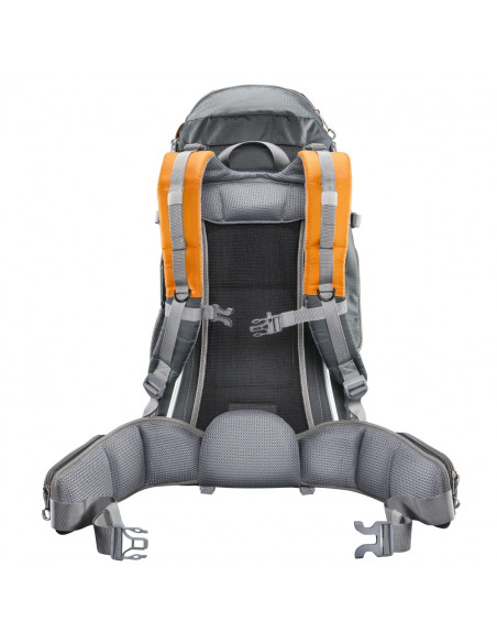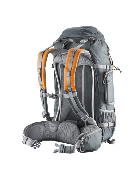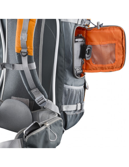 Access to the camera compartment from the side and there is also an option for simply and quickly fastening trekking sticks and a tripod. The detachable lap belt provides optimal protection and hold (its length is up to 115cm) and the small zip closed pockets provide adequate storage space for smartphone, keys or purse. The detachable rain cover and the long lasting outdoor material protects the equipment against rain, dirt and snow. The comfortable paddings provides a high level of comfort, also for lo0nger trekking tours. One can also simply remove the aluminium frame to additionally save weight. The individually adjustable inside space with various dividers enables secure storage of the equipment.