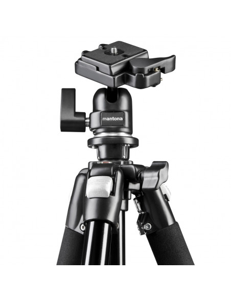 The mantona Scout is delivered including ball head and quick-release system. The camera plate is normed and can be used with all common tripods. The ball head allows quick reacting to changing light conditions. It can be turned in all directions without problems.