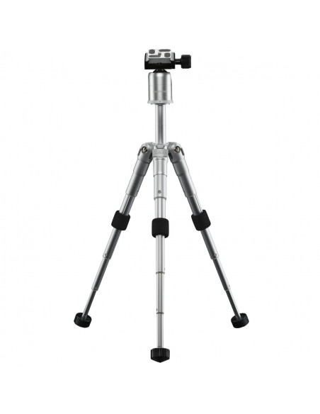 The mini-tripod with a fashionable design has a load capacity of 5 kg and is perfectly suitable for large reflex cameras – and it only weighs 740 g. Sturdy rubber feet, a twist lock for four sections and three angle adjustments ensure the tripod will stand firmly on any type of terrain. Thanks to packing dimensions of only 13.5 cm, this tripod made from light aluminium can be comfortably carried and is perfectly suited for travel and outdoor activities. A tripod bag is also included.
