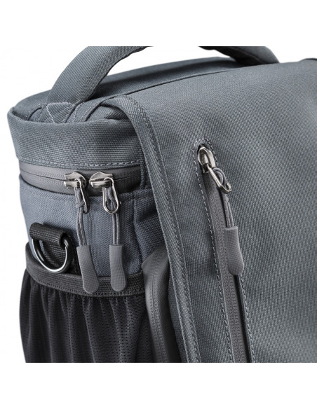 The bag can be worn in different ways according to need. The adjustable shoulder strap is padded and is attached to the bag with high-quality carabiner hooks. Alternatively, and to increase safety, the drone bag can also be worn close to the body with an additional hip strap (adjustable up to 130 cm). It also is fitted with a safety lock. Thus, your valuable drone is maximally secured. The carry handle on the bag is pleasantly padded and features high-quality stitching. The external zips are thoroughly watertight. The external material is water-resistant.