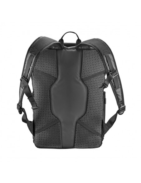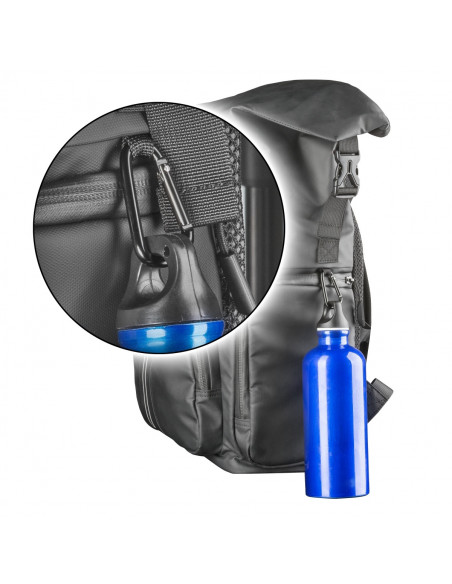 - Integrated laptop compartment with soft surface (for laptops up to 14”). Outside pockets placed on front and side. Additional compartments for additional accessories or small parts. With carabiner hooks for a water bottle, for example.