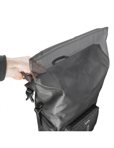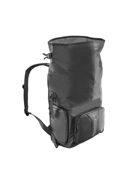 - Upper section accessible with lots of space for special equipment. Backpack is rolled shut. Material and zips are water-repellent. Thanks to the rain protection cover, everything will remain dry, even in heavy rain.