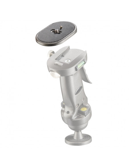 The anti-slip rubber buffer on the top in combination with the integrated drop protection pin guarantee a secure hold of your equipment in the tripod head. The 1/4 inch camera attachment screw can be screwed on without tools thanks to the D-ring mounted on the back. The easy-to-use locking mechanism of the interchangeable plate on the tripod head allows the camera to be inserted into or removed from the tripod head easily and within a very short time.