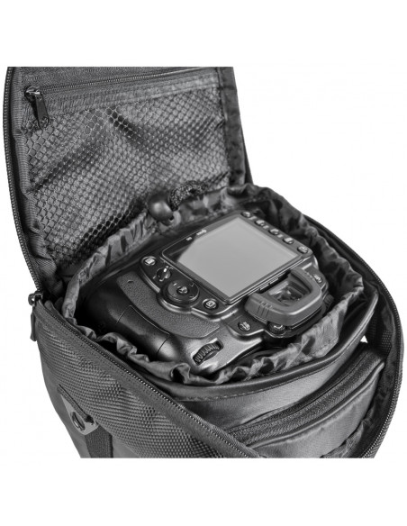 The mantona Neolit Holster camera bag offers optimal protection for your DSLR camera with mounted lens, combined with perfect carrying comfort. With the quick access on top of the bag your camera is always ready for use. Since the lens can always remain on the camera, you can let your creativity take its course and do not lose any valuable time.