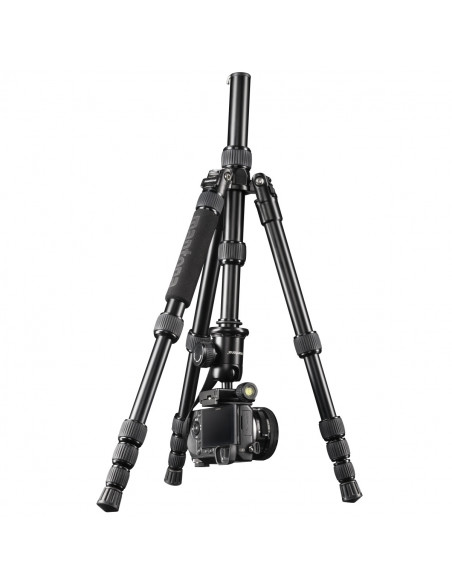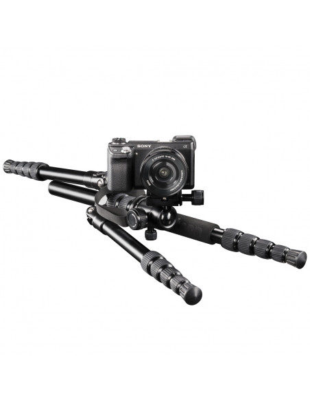 The travel tripod DSLM Travel from mantona is an extremely compact tripod, ideally suitable for travels. With a total weight of approx. 1300g this aluminium tripod is light and can be transported in the supplied bag without any problems. The leg angles can be adjusted up to 180°, so that you can fold it up for transportation to a compact length of 35 cm and achieve even higher flexibility in use. Even ground level shots are thus no problem. Four leg segments with quick-action locks enable uncomplicated height adaptation as well as quick set-up and disassembly. The tripod can be extended to a height of 143 cm. Rubber coated tripod legs ensure high stability. Particularly convenient: The tripod can also be used as a monopod. The monopod can be extended by means of the extendable two stage centre column. The centre column has a weighting hook, which can be used to hang up weights for stabilizing the tripod. The ball head is equipped with a convenient panorama scale, changing to portrait format is possible without any problems. For exact alignment the ball head has two convenient bubble levels - one for portrait and one for landscape format. With a ¼ inch and 3/8 inch tripod screw the camera can either be mounted with a quick-release plate to the head or directly on the tripod. With a maximum load bearing capacity of approx. 5 kg, the tripod is the ideal solution for use with system cameras.