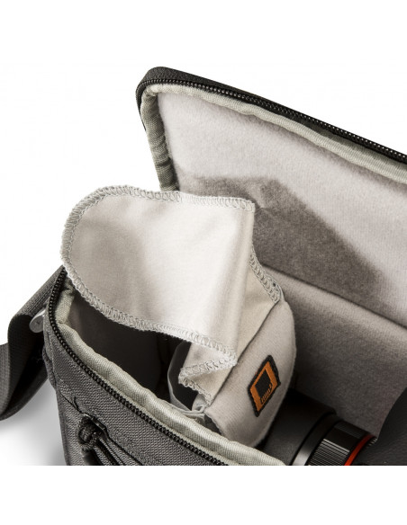 The mantona Irit system camera bag unites all advantages of a camera bag with the design of a sporting shoulder bag. The mantona Irit is comfortably padded, so that your system camera and the associated accessories are protected against impact at any time. With the divider, the inside can be separated as desired. The transport of a camera with lens attached is thus no problem with this sporting elegant camera bag. The divider is additionally equipped with a micro-fibre cloth and a bag for your mobile phone and a SD-card compartment.