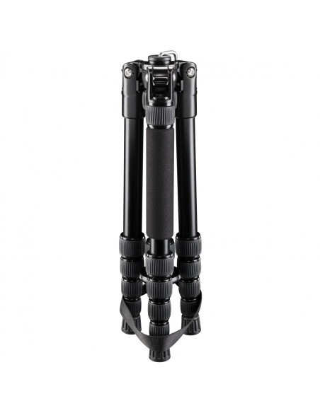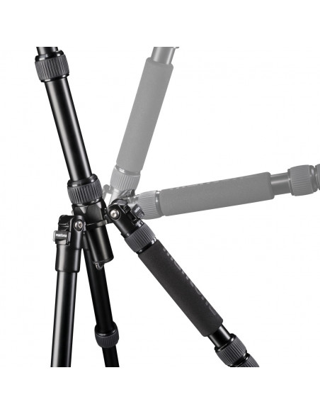 The travel tripod DSLM Travel from mantona is an extremely compact tripod, ideally suitable for travels. With a total weight of approx. 1300g this aluminium tripod is light and can be transported in the supplied bag without any problems. The leg angles can be adjusted up to 180°, so that you can fold it up for transportation to a compact length of 35 cm and achieve even higher flexibility in use. Even ground level shots are thus no problem. Four leg segments with quick-action locks enable uncomplicated height adaptation as well as quick set-up and disassembly. The tripod can be extended to a height of 143 cm. Rubber coated tripod legs ensure high stability.