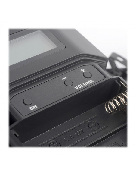 The set consists of a transmitter, a receiver, a lavalier microphone and corresponding accessories. Use up to four different microphones with this transmitter and receiver.
