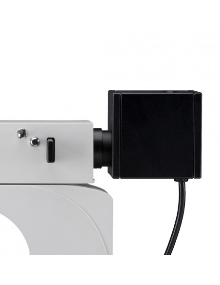 In the microscope's basis, there are a transmitted light LED illuminator (3 W) as well as the power supply and the continuous adjustable dimmer for transmitted light. The trinocular head allows to mount a SLR camera or a USB microscope camera with an optional adapter. The inclination of the eyepiece tubes is 30°. The fluorescence attachment includes a special LED wheel with four different lamps (green, blue, violett, ultraviolett), a filter wheel and a radiation shield. The LED lamps produces the exciting radiation in order to get fluorescence.