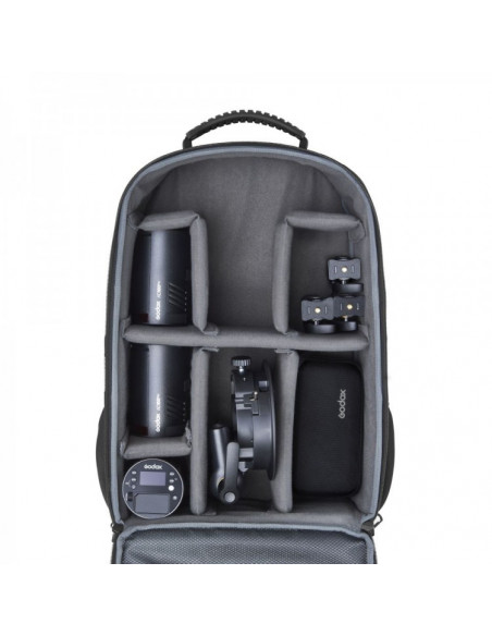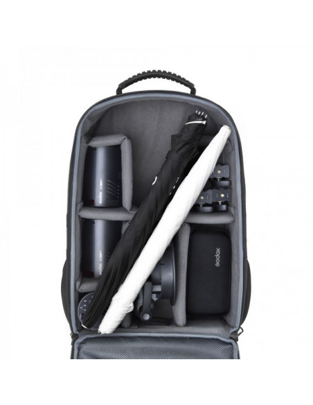 CB20 backpackThis CB20 Backpack from Godox can hold AD100Pro, AD200, AD200Pro, AD300Pro, or AD400Pro strobe units complete with batteries, chargers, wireless remotes, and compact umbrellas for a fully portable lighting setup. Even when fully packed with the lights and accessories, the CB20 still has room to add a camera with lenses and a spacious lined pocket holds a 15" laptop or tablet.