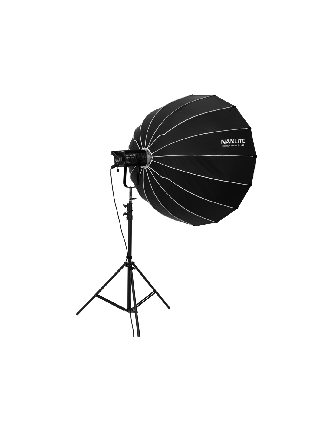 **Nanlite SB-PR-150-QMed en 16-sidet hexadecagon-formet modifikator. Strukturen i Para 150 er forstærket af 16 holdbare støttestænger, mens dens sølvfarvede indre maksimerer din lyskildes output. Den giver et fokuseret, blødt output med en kraftig, skarp kant, der giver dimension og detaljer til dit motiv samt et naturligt blikfang i deres øjne. Modifikatorens parabolske form giver desuden et betydeligt fald ved feltkanten og derfor en forbedret grad af retningskontrol, reduceret spildlys og nem udblænding.