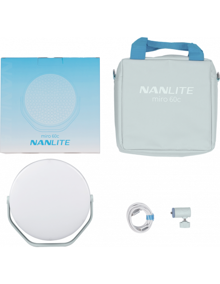 Den Nanlite miro 60c tilbyder alle de avancerede funktioner i miro-serien i et højere output 60 W RGBWW LED-panel, der leverer 8.210 lux @ 1 m, 5600K. Den er designet til krævende skabere, filmskabere og fotografer og kombinerer professionel belysning med et bærbart, kompakt design.Drevet af Nebula C4-farvemotor sikrer miro 60c overlegen farvenøjagtighed og -stabilitet. Dens CCT-område på 2700K til 7500K med ±150 grøn/magenta-justering gør det nemt at matche andre armaturer eller omgivelseslys. I RGB-tilstand med HSI-kontrol kan du skabe ubegrænsede farver, mens de 14 indbyggede effekter  muliggør hurtige, dynamiske lysopsætninger til filmiske resultater.Kontrolmulighederne er enkle og effektive. Juster indstillingerne direkte på 1.28" runde display eller styr lyset trådløst ved hjælp af Bluetooth og NANLINK-appen.Miro 60c understøtter duale strømløsninger: tilslut via USB-C PD til studiebrug eller kør på NP-F-batterier til bærbare opsætninger. Dens 45° optik giver en klar, fokuseret stråle, og den medfølgende magnetiske diffuser blødgør lyset, når det er nødvendigt. Den 5/8"-babymodtager med 1/4"-20-gevind gør det nemt at montere den på en lang række understøtninger.Nøglefunktioner60 W RGBWW LED-panel, der leverer 8.210 lux @ 1 m, 5600KNebula C4-motor sikrer præcis, stabil farveydelseCCT-område: 2700K-7500K med ±150 grøn/magenta-kontrolRGB-tilstand med HSI-kontrol for ubegrænsede kreative muligheder14 indbyggede lyseffekter til filmiske looks14 indbyggede lyseffekter til filmiske looksKontrol via indbygget display eller NANLINK-appDobbelt strøm: USB-C PD eller NP-F-batterierMagnetisk diffuser medfølger til hurtig, blød belysningHvad er der i æsken1x Nanlite miro 60c light1x Magnetic diffuser1x 5/8" babymodtager med 1/4"-20-gevind1x USB-C-kabel1x brugervejledning1x bæretaske