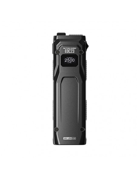 , Short but powerful, unrivalled performance The EDC23 is an ultra compact torch that combines top performance with a slim and light design. At just 13.5 mm thick and weighing 101 grams, it offers 2500 lumens of brightness and a range of 280 metres. The torch features a built in 1500mAh battery for a maximum working time of 39 hours, a multifunction OLED display, and a robust stainless steel and carbon fibre construction. Ideal for everyday use (EDC) and tactical situations, with innovative features such as Rapid Lock⢠and advanced heat management technology. Perfect for anyone looking for maximum performance in a compact size. Highlights Ultra compact and lightweight design Maximum 2500 lumens brightness. Achieves a projection distance of up to 280 metres. Built in 1500mAh Li ion battery. Advanced technology The EDC23 torch combines advanced technology and durability in a compact design. With the UHi 25 LED, it offers accurate and bright illumination of 6500K, supported by a multi function OLED display that shows brightness level, battery status and runtime. Thanks to Rapid Lock⢠and tactical controls, the torch responds quickly in critical situations. Robust construction The robust construction of stainless steel, carbon fibre composite and aluminium heat sink makes it resistant to compression, bending and wear. The ATR module ensures advanced heat management and optimal performance, while the IP54 rating provides protection against water and dust, making it suitable for a variety of conditions., Max light output 2,500 lumens Maximum Beam Distance 280 Metres Max Beam Intensity 20,720cd Max burn time 39 h 0 m LED 2 x NiteLab UHi 25 LEDs Reflector OP Battery Built in 1,500mAh Li ion battery Beam colour White Light Length 102.8mm Head Size 33.0mm Weight 101g 2 year warranty , 1 x Nitecore EDC23 Flashlight 1 x USB C charging cable 1 x Lanyard 1 x User guide