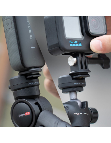 Smooth and fast The PGYTECH CapLock Action Camera Quick Release Set is designed to quickly attach action cameras, smartphones and other small photo devices to tripods and other supports.  Highlights Wide compatibility with multiple interfaces 1/4" adapter Quick and convenient mounting and dismounting Double locking  Quadruple installation for flexible shooting The set has a 1/4" adapter for easy compatibility with tripods and suction cups. Thanks to the unique Quick Release system and double locking mechanism, safe and quick installation is guaranteed. The adapter's four way installation allows you to switch smoothly between selfies and capturing someone else., Compact and portable Wide compatibility with multiple interfaces 1/4" interface for easy compatibility with such as tripods  Quick and easy mounting and dismounting Double lock design for improved stability Four way installation for flexible shooting  Material: Nylon + Glass fibre Dimensions: 32mm x 37mm x 15mm     Weight: 40g , 1 x PGYTECH CapLock Action Camera Quick Release Set   1 x Action Camera Adaptor  1 x Thumb screw  1 x 1/4" Adapter 1 x S4 Allen key , Action cameras from GoPro/Insta360/DJI and other brands Smartphones