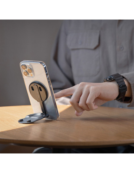 Capture every angle, anytime, anywhere The PGYTECH MagFlex Phone Photography Stand(Misty Gray) is a smartphone holder designed for photography enthusiasts. It can be magnetically attached to the back of a phone with MagSafe functionality or a phone with a magnetic ring. The elastic strap ensures safe and comfortable one handed operation while taking photos. When opened, the cover serves as a phone stand and supports the phone on the desktop for watching videos or shows. The extended bar is suitable for phones of different sizes. Highlights Flexible swivel Magnetic design Handy and durable Compact and versatile phone holder Lightweight and comfortable to use, this phone holder is easy to carry and store. The 45° elastic band design provides a stable grip in both horizontal and vertical positions. Thanks to an infinitely rotating axis and magnetic design, you can seamlessly switch between screen orientations. With a maximum rotation angle of 300°, it is ideal for low camera angles. Suitable for different phone sizes, with modes such as case mode and handheld selfie mode. Includes replaceable strap, made of durable metal for long lasting use. , Material: plastic + aluminium alloy + quinlon Product size: 58 x 95 x 6.1mm (partial thickness 7.1mm) Maximum rotation angle of the stand: 300 degrees Vertical suction of the magnet: 12N Weight: 47.2g , 1 x PGYTECH MagFlex Phone Photography Stand 1 x Magnetic ring 1 x Replacement strap 1 x User guide